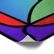 Ein buntes Glasdesign, das den Ostermorgen illustriert, mit einem roten Kreuz, das auf grünen Hügeln neben einem feurigen Sonnenaufgang stehend ist.