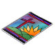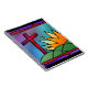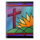 Ein buntes Glasdesign, das den Ostermorgen illustriert, mit einem roten Kreuz, das auf grünen Hügeln neben einem feurigen Sonnenaufgang stehend ist.