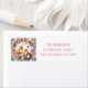 Farbenfrohe Ostern-Rücksendeadressen-Aufkleber mit zwei Entenlingen, umgeben von schönen Frühlingsblumen und dekorierten Ostereiern. Der Hintergrund hat ein weiches, kariertes Muster in Pastellfarben, das die Ästhetik insgesamt ergänzt.