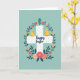 Entworfen mit einem beruhigenden, gedämpften Türkis als Hintergrund, zentriert sich die Karte auf eine einfache weiße kreuzartige Form, die mit winzigen, sanft getönten Punkten bestreut ist. Ein ovaler Kranz umgibt sie, gefüllt mit tiefgrünen Blättern und Frühlingsblumen in Rosa, Fuchsia, Pfirsich und sanftem Blau, was der Szene ein gemütliches, verbundenes Gefühl gibt, als ob Freunde zusammenkommen 🌷. Zwei kleine gelbe Küken sitzen auf der weißen Form, ihre orangen Schnäbel sind aufeinander zugeneigt, als ob sie einen stillen, liebevollen Moment teilen 🐰. Der Ausdruck „Frohe Ostern“ sitzt quer über dem mittleren horizontalen Balken in einem fließenden, kalligrafieartigen Stil, dargestellt in einem dunkleren Ton, der sich klar gegen das Weiß abhebt. Kleine weiße und braune Punkte erscheinen um den Kranz und über die Mitte, wiederholen die gepunktete Textur und fügen eine leichte, luftige Note hinzu. Die Blumen variieren in Größe und Abstand, mit gehäu