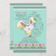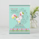 Ein niedlicher Osterhasen ist in dieser zauberhaften, saisonalen Einladung unterwegs. Der aquamarine Hintergrund ist mit einem Ostereier und einem Rand mit roten und rosa Tulpen ausgestattet. (RP)