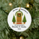 A personalized keepsake ornament celebrating a couple's first Christmas in their new home. Features a charming front door illustration and custom details like address, names, and year.