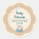 A cute co-ed baby shower invitation companion sticker, with a travel and adventure theme, featuring a scalloped frame with cute characters and travel related elements, with the title Baby Adventure Club. Perfect for future parents who love to travel, who love the adventure theme for a baby shower.