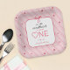 This charming sweetheart-themed birthday party paper plates are a cute accent for a little girl celebrating her first birthday near Valentine’s Day. The design features elegant script lettering on a backdrop of white stripes and cute little watercolor hearts, finished with an adorable bow for a lovely, girly touch.