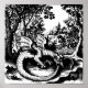 Zeichn eines mittelalterlichen Drachen, der seinen Schwanz in einem Wald beißt.