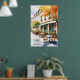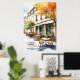 Das Poster eines hübschen Cafés im Freien ist mit einigen leeren Korbsesseln und runden Tischen, Set vor dem Hintergrund eines malerischen, zweistöckigen Gebäude mit grünen Markisen und lebhaftem Grün dargestellt. Die sanfte, warme Beleuchtung verleiht der Szene ein einladendes Ambiente.