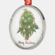 Ovales Ornament mit rotem Bandhalter. Originelles Weihnachtsbaumdesign mit roter "Frohe Weihnachten!" Nachricht unten.