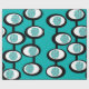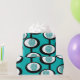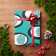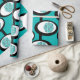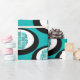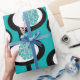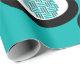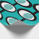 Dieses Verpackungspapier hat ein modernes Design von Linien aus der Mitte des Jahrhunderts, die Kreise in den Ovalen bilden, die in Türkis, Schwarz und Weiß zusammengeschraubt sind.