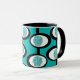 Diese Tasse hat ein modernes Design von Linien, die Kreise in den Ovalen bilden, die in Türkis, Schwarz und Weiß zusammengeschraubt sind.