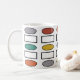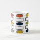 Diese Tasse hat ein modernes Design aus sich wiederholenden Rechtecken und Ovalen in Retrofarben.