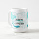 Tasse des Kaffees, um andere an ein wichtiges Thema zu erinnern - dass wir alle das Bewusstsein für Eierstockkrebs unterstützen! Messaging ist verbunden mit einem neon aquamarinen blauen Schmetterling und aquamarinen Band.