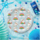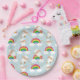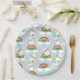 Prato de papel com ilustração de ovelhas no céu estrelado com arco-íris e nuvens.
