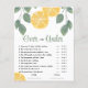 Over or Under Lemon Bridal Game - hier ist eines der gängigen Brautparty-Spiele, um Ihren Gästen eine gute Zeit zu geben. Da es als Vorlage vorbereitet wird, können Sie es nach Ihren Wünschen/Bedürfnissen personalisieren. FÜR WEITERE SPIELE MIT DEM GLEICHEN DESIGN schreiben Sie G105 in der Suchbox meines Shops. Danke, dass du meinen Laden besucht hast! Für den Fall, dass Sie etwas über Design brauchen, können Sie mich kontaktieren: szdesigns2021@gmail.com