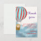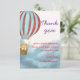 Baby showers thank you card features cute cub on a hot air ballon flying over the clouds.