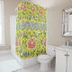Duschvorhang mit einem Peony Blumenmuster aus Owen Jones' A Study of Chinese Ornament. Dieses Muster zeigt auf einem gelblichen Hintergrund die Pfennigfugen und andere Blume.