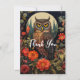Vielen Dank Karte mit einer cool aussehenden Eule mit einem Piercing-Blick. Ein Vollmond im Hintergrund mit einem Garten mit roten Blume.