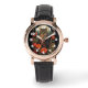 Watch with a cool looking owl with a piercing stare. A full moon in the back with a garden of red flowers.