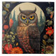 Ceramic tile with a cool looking owl with a piercing stare. A full moon in the back with a garden of red flowers.