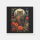 Paper napkins with a cool looking owl with a piercing stare. A full moon in the back with a garden of red flowers.
