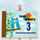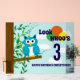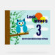 Schau, wer Geburtstag hat! Blauer Eule in einer Waldlandschaft mit blauen Himmeln und flauschigen Wolken