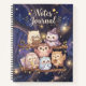 Adorable spiral notebook featuring a charming group of pastel owl friends perched on tree branches in a dreamy moonlit forest with glowing stars and magical details. Perfect for notes, journaling, writing, school, and anyone who loves cute woodland stationery. A sweet and enchanting notebook design full of softness, warmth, and whimsical forest charm.