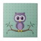 White Keramik Tile hat eine niedliche lila Cartoon-Eule auf einer Extremität mit einem grünen Polka Punktmuster Hintergrund. Anpassbar.