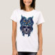 Dieses visuell auffällige Bild zeigt einen Schädel, dessen Kopf einer Eule überlagert ist. Die Augen der Eule sind groß und ausdrucksstark, während sich ihre Federn nahtlos in die Knochenstruktur des Schädels einfügen. Die Farbpalette besteht aus einer Kombination aus Blau, Weiß und Schwarz, wodurch ein bemerkenswerter Kontrast entsteht. Das Bild wird in einem kühlen, grafischen Stil mit starken Linien und lebhaften Farben dargestellt.