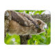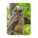 Ein wundervolles Bild einer süßen, schwindelnden Eule, die auf einem Ahornbaum steht und die Kamera anstarrt.