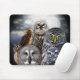Dieses Bild einer Gruppe von Eulen ist auf einem Hintergrund von Wolken im Nachthimmel und einem leuchtenden Mond.