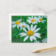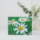 Eine attraktive Postkarte mit einem Foto von Oxeye-Blume auf einer Wiese mit Regentropfen. Die Karte ist eine elegante Art, einem Naturliebhaber Grüße zu schicken.