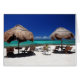 Ein weiterer schöner Strand an der Riviera Maya, zwischen Playa del Carmen und Tulum gelegen, ist der Strand von Paa Mul. Dieser Strand ist etwas felsig, aber wenn man vorsichtig hineingeht, kann man die ganze Meereswelt genießen, nur einen Meter vom Ufer entfernt. Paa Mul, Quintana Roo, MexikoEs gibt einige große Sonnenschirme oder Hütten mit einigen Stühlen im Vordergrund und ein tiefblaues und türkisfarbenes karibisches Meer im Hintergrund. Einige Wolken sind auch am Horizont zu sehen.