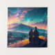 Ein schönes digitales Bild eines Paares, das nachts auf einem Dach sitzt und die Sterne ansieht. Der Himmel ist voller Sterne aller Farben, und die Milchstraße ist in der Ferne sichtbar. Das Ehepaar sitzt nah zusammen und sieht so aus, als würden sie sich gegenseitig die Gesellschaft und die Schönheit des Nachthimmels erfreuen.