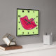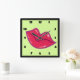 Ein Paar leuchtende rote Lippen mit einem kleinen Funkeln und einer lila und gelben Kontur. Feine weiße Highlights geben ihm einen glänzenden Look. Auf einem weichen, grünen Hintergrund mit schwarzer Uhr.