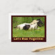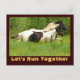 Foto Illustration zweier schwarz-weißer Pinto Pferde, die auf einem Galopp mit dem kühnen Sprichwort "Let's Run Together" in einem Holzkorntext laufen.