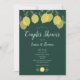 Mit Zitronen und Grün auf smaragdgrünem Hintergrund ist diese schicke Botanische Paare Dusche-Einladung personalisiert mit Ihren speziellen Veranstaltungsinformationen. Das Gegenteil hat ein Monogramm der Initialen des glücklichen Paares. Entwickelt von Thisisnotme©