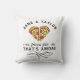 Personalisieren Sie dieses lustige Kissen mit den Namen von Ihnen und Ihrem Ehemann. Das Design umfasst zwei Scheiben köstlicher Pizza mit Käse, Pepperoni, Paprikaschoten und Pilzen und die Worte "Pizza Pie That's Amore". Ideal für ein Pizzaliebhaber!