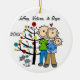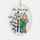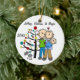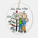 Eine hübsche runde Keramikandenken Weihnachtsfeiertagsverzierung kennzeichnet ein Strichmännchenpaar mit einem Babyjungen in einer blauen Decke und in einer Katze, die vor dem verzierten Weihnachtsbaum mit Bereichen stehend sind, die Sie mit Namen und Datum zum laufenden Jahr leicht besonders anfertigen können! Diese schöne Feiertagsandenkenverzierung macht ein großes Geschenk für jedermann, das ein neues Baby im laufenden Jahr hatte!