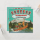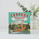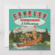 Fantastische Paare Wochenende Party mit einer überarbeiteten Postkarte von zwei Mädchen und einem Typ Balancieren in einem Kanu in den Anzügen mit einem Berghang. Weicher Fokus mit leichten Texturen einer Vintagen Postkarte. Handgezeichnete Illustration eines Retrozeichens, um Ihre Gallen und Typ Freunde zu einem tollen Wochenende willkommen zu heißen.
