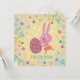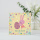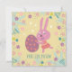 wenskaart voor Pasen met illustratie van paashaasje met chocolade ei, in kader van bloemen. tekst voorkant 'vrolijk pasen' ( kan aangepast worden)