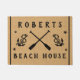 "Beach House"-Text mit Kanuspaddeln, Ankern, Seestern und Ihrem Familiennamen - Imitat rustikaler Oberschenkelhintergrund mit schwarzem Hintergrund