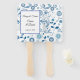 Dieser Paddle-Fan wird mit einem schönen blauen und weißen Blumendruck mit Beispielnamen und Datum gezeigt. Passen Sie dieses Element an, und ändern Sie die Beispielnamen und das Datum auf Ihren.