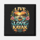 A serene heart-shaped lakeside scene celebrates the love of kayaking amid mountains, flowers, and golden sunset skies.
