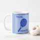 "Ein grafisches Design mit einem Paddelschläger dominiert die Mitte, darunter die Worte "PADEL FANATIC". Das Design verwendet ein zweifarbiges Farbschema mit hellgelbem Hintergrund und blau für die Elemente und Rahmen des Designs."
