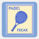 Im Zentrum dominiert ein grafisches Design mit einem Paddelschläger, darunter wird der Begriff "PADEL FREAK" hervorgehoben. Das Design verwendet ein zweifarbiges Farbschema mit hellgelbem Hintergrund und blau für die Elemente und Rahmen des Designs.