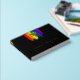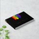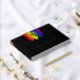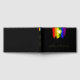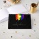 Charmantes lgbtq Hochzeitsgast-Buch mit Regenbogenflagge gezeichnet mit unordentlichen Schlagstöcken und mit einem goldenen Folienherz auf schwarzem Hintergrund verziert. Gay Hochzeitsgast-Buch in Schwarz mit Herz- und Regenbogenpinselstrichen und eigenem Goldfolientext. Lesbisches Hochzeitsguestbook mit einem Herz auf regenbogenfarbenen Pinselstrichen.