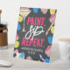 Es ist Zeit zu malen und zu lockern! Geben Sie Ihrem Brautkommando etwas, um sich an ihre lustige Farbe zu erinnern und Party mit einer Farbe und schlucken Party Willkommensschild Podestal. Stellen Sie sich einfach den Namen der Braut und das Datum des Party ein, damit Sie sich rundum wohl fühlen. Das Design umfasst Typografie-"Farbsip-Wiederholung" sowie Spritzer mit gelben, roten und blauen Spritzern sowie handgemalte Farbpalette, Farbpinsel und Glas auf einem Chalkboard-Hintergrund.