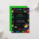 Farbenfrohe Plätze Hintergrund Paintball Geburtstagsparty Einladung. Paintball-Spieler mit Maske, der einen Paintball schießt. Passen Sie Ihre Party an.
