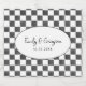 Create personalized labels for champagne bottles and more. This paper label is ready to be personalized with the names of the bride and groom and their wedding date. The black text is set inside of a white oval-shaped frame and set against a black and white checkerboard pattern. Black painted squares are alternated with plain white squares to form this check pattern.