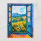 A serene painting capturing the view from a terrace window overlooking vibrant sunflower fields in the countryside during summer. A perfect depiction of tranquility and nature's beauty.