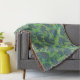 Ein lustiges Throw Blanket mit Elephant-Silhouetten, gefüllt mit einem dunkelblauen und bordeauxfarbenen Paisley-Muster, auf einem Hintergrund von grünen Palmen Blätter. Teil der Posh & Painterly 'Heffalumps' Kollektion.
